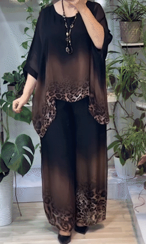 This two-piece set features a breezy chiffon overlay top with a stunning ombre effect and bold leopard print hemline. The wide-leg pants mirror the gradient design, creating a fluid silhouette with effortless elegance.
