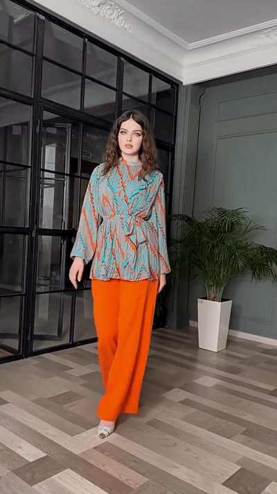 This pleated two-piece set stands out with its bold geometric print and eye-catching color combinations. The lightweight top flows effortlessly over the body, while a removable waist tie lets you shape your silhouette with ease. Paired with wide leg pants in a matching tone, it blends comfort and modern style seamlessly.