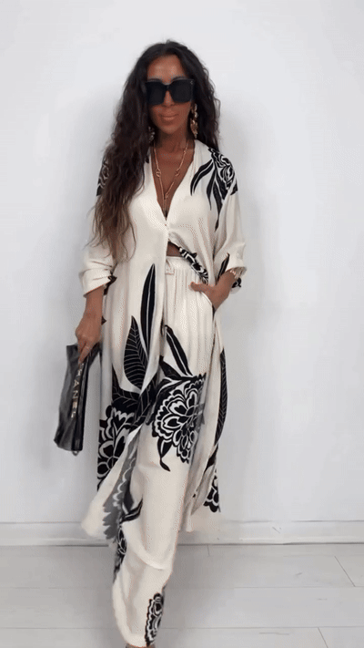 Crafted from soft, breathable fabric, this elegant two-piece set features a flowy button-front long shirt with eye-catching floral prints. The matching wide-leg pants offer a relaxed fit with an elastic waistband, ensuring both style and comfort in one effortless outfit.
