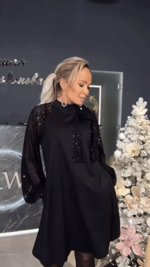 Crafted for timeless elegance, this dress features shimmering mesh sleeves and a subtle A-line silhouette that flatters every figure. The high neckline and soft draping create a graceful, feminine frame, while the sequin details add just the right touch of festive sparkle without going over the top.