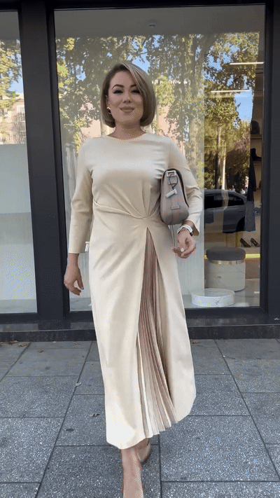 Made from a smooth, structured fabric with gentle stretch, this elegant midi dress brings modern sophistication with its refined silhouette. The standout twist waist detail beautifully sculpts the midsection, while the pleated insert peeking from a side slit adds graceful motion and quiet allure.