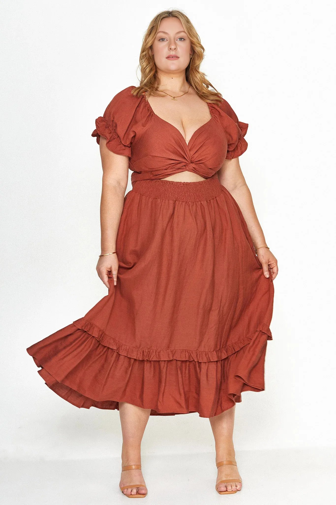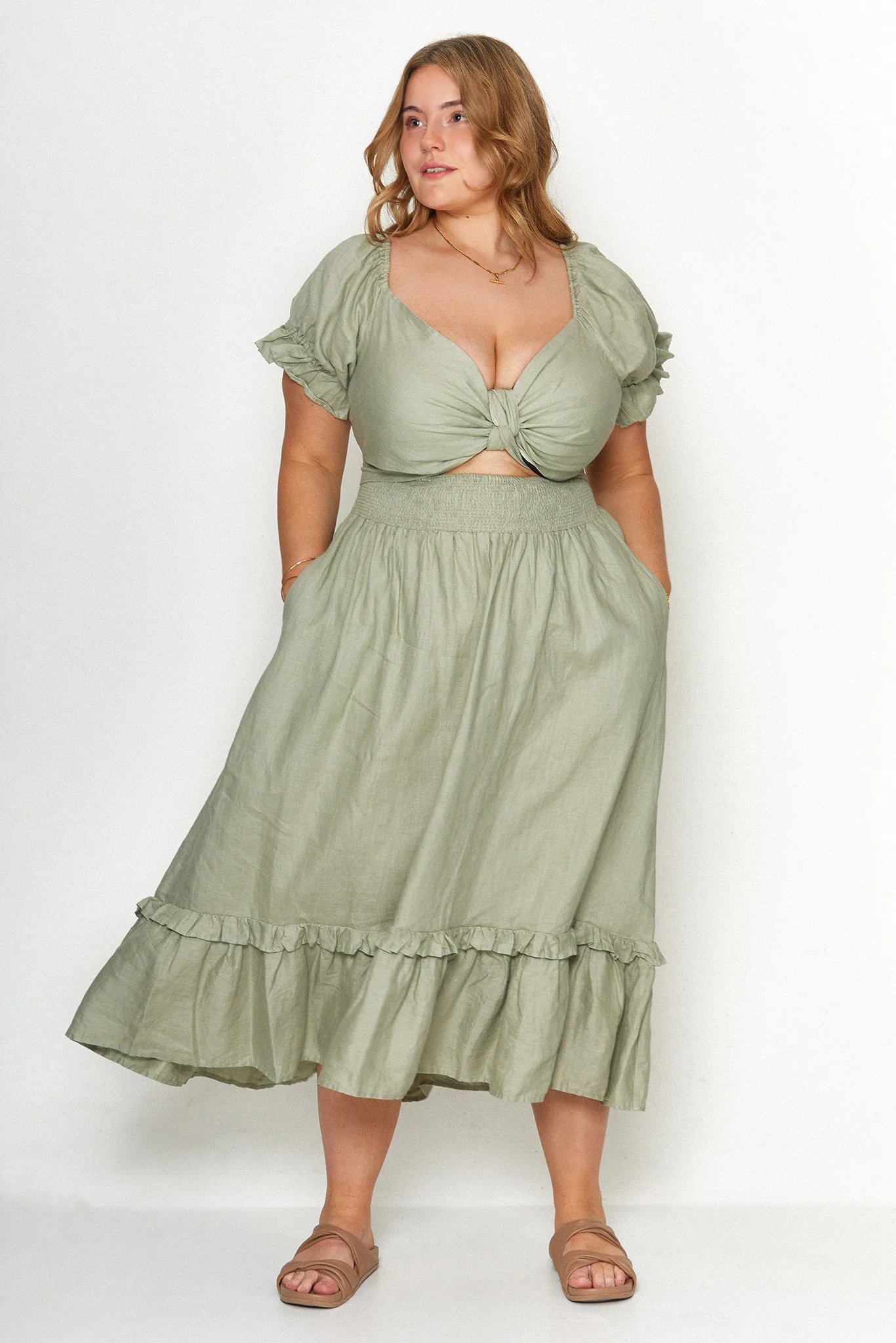 Elasticated shirring for the perfect fit and beautiful A-line skirt that sits. The top is a gorgeous puffy sleeve and the hem is a sweet ruffle design. We love how the ruffles hem gently flutters as you walk.