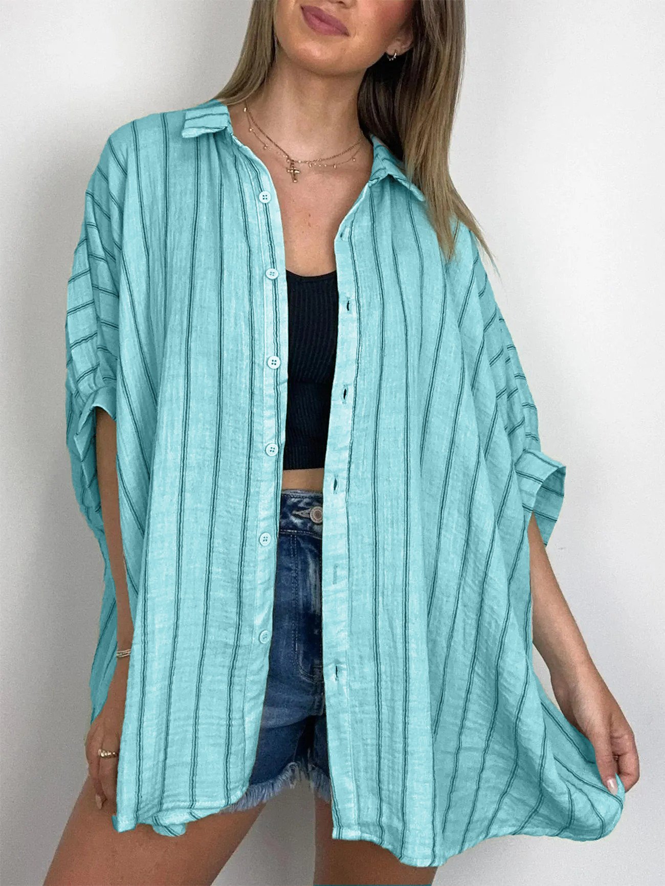 Unleash your inner fashion maven with the Oversized Striped Button Down Top. Made with a comfortable cotton gauze, this blouse features a drop shoulder design for a relaxed fit.
