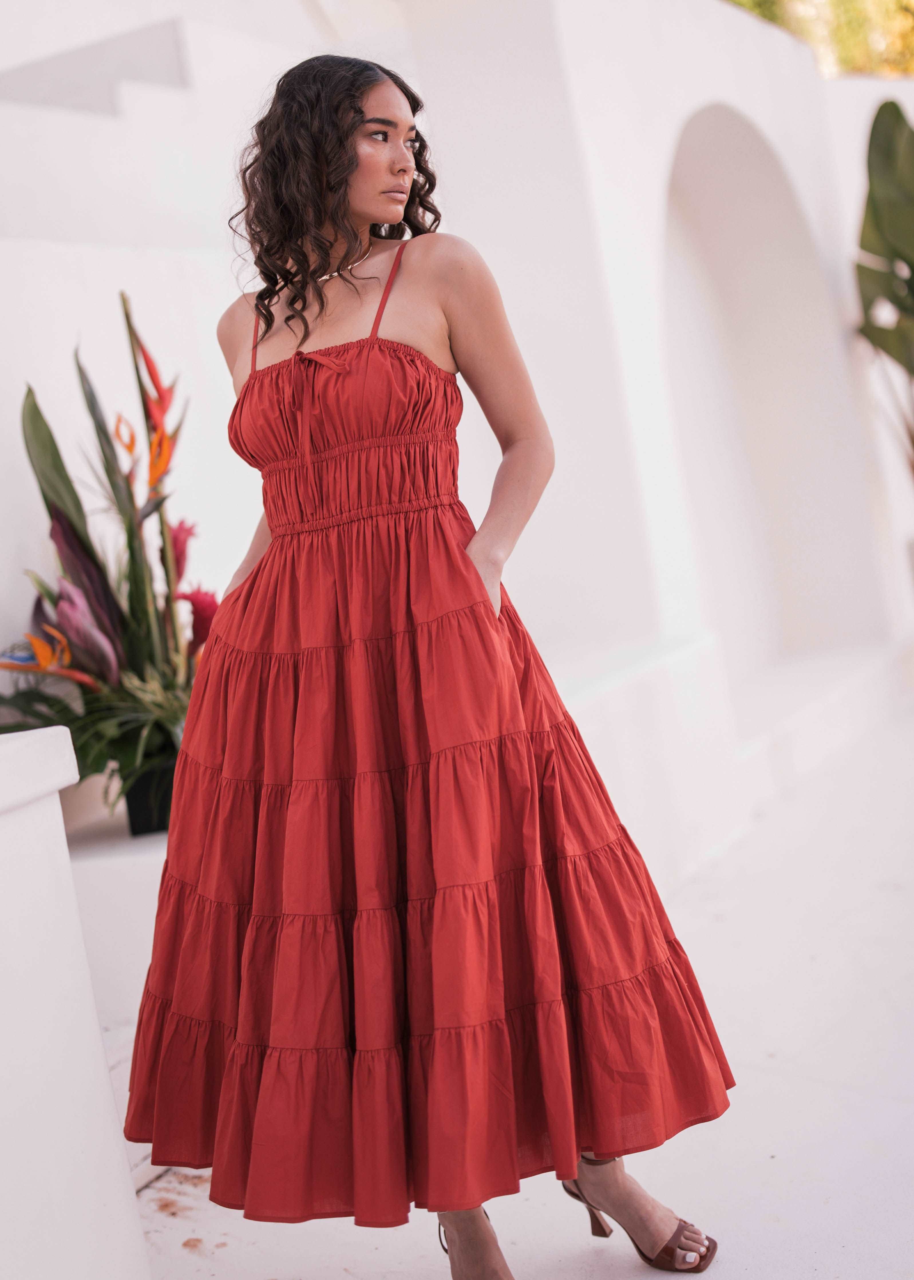 Embrace the serenity of summer nights with our enchanting tiered dress. Crafted for beach-ready elegance, its flowy silhouette and tiered ruched bodice effortlessly capture the essence of a beach babe's dream. Adorned with delicate straps and a charming bow accent on the neckline, this vibrant beauty exudes breezy sophistication, perfect for bonfires by the shore or sunset strolls along the coast.