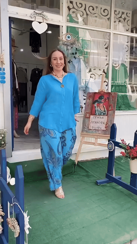 Paired with flowy, printed wide-leg pants, this set brings both comfort and charm to your everyday style. Whether you're strolling through the market, meeting friends for brunch, or simply soaking in the sun, it’s your go-to for laid-back sophistication.