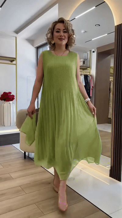 This sleeveless maxi dress features an elegant pleated design and comes with a matching single-sleeve chiffon overlay for added flair. The flowy fabric and relaxed fit offer effortless comfort while creating a graceful silhouette.